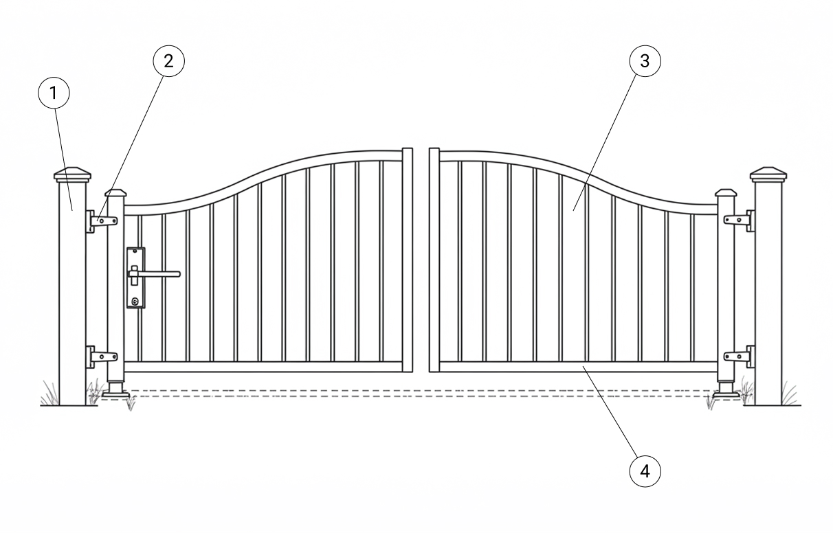 Двойные распашные ворота: Подходят для широких проездов и участков. Они состоят из двух створок, которые открываются в обе стороны, что удобно для въезда крупного транспорта.